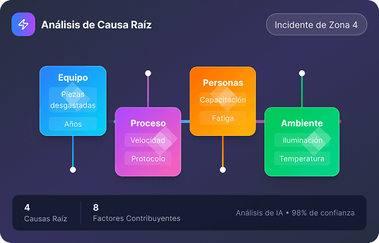 Análisis Avanzado de Causa Raíz con razonamiento multihilo, los Cinco Porqués y modelos de Espina de Pescado. Genera acciones correctivas con puntuación de esfuerzo e impacto.