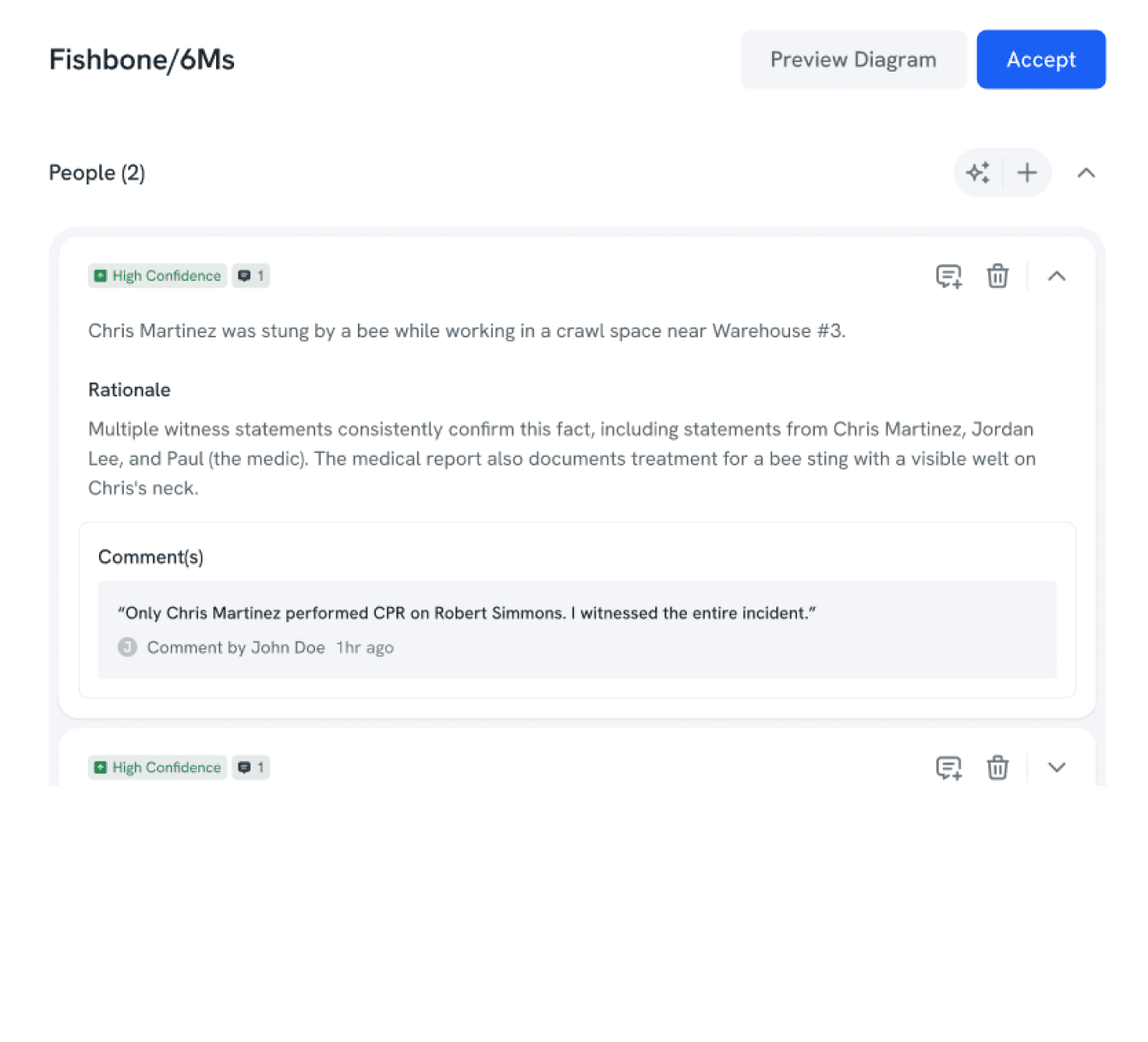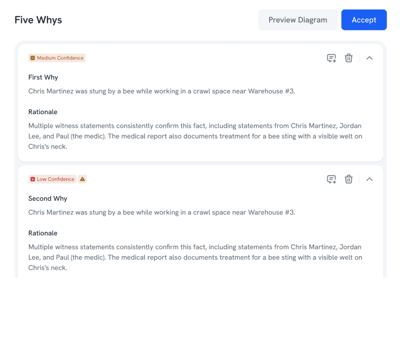 Similar to 5 Whys, AI generates potencial ‘branches’ of logic, with confidence scores.